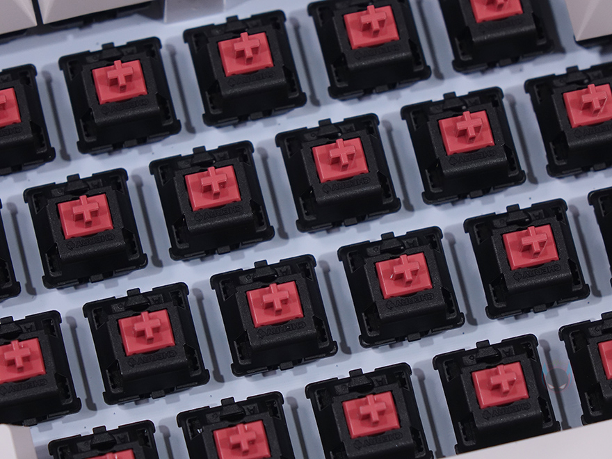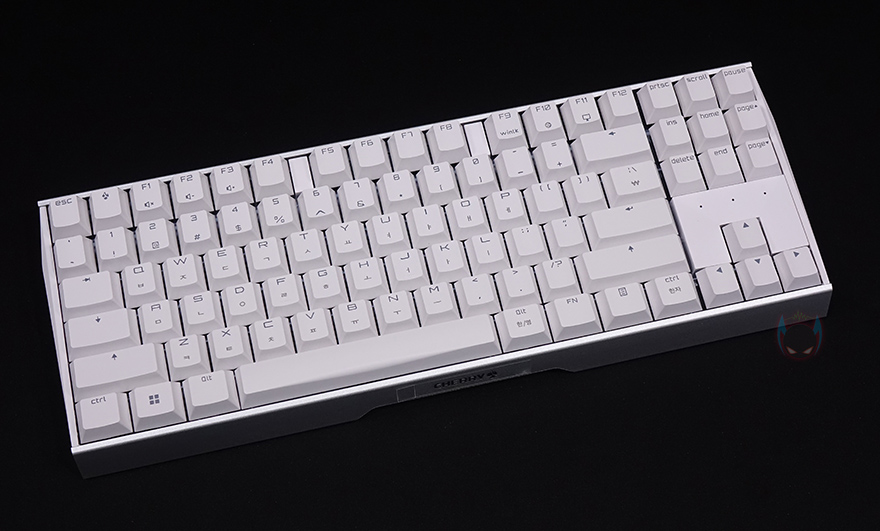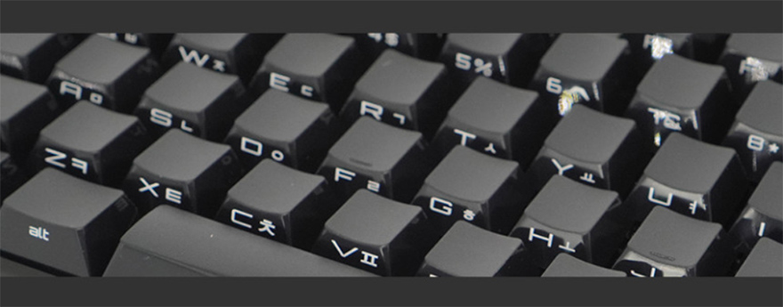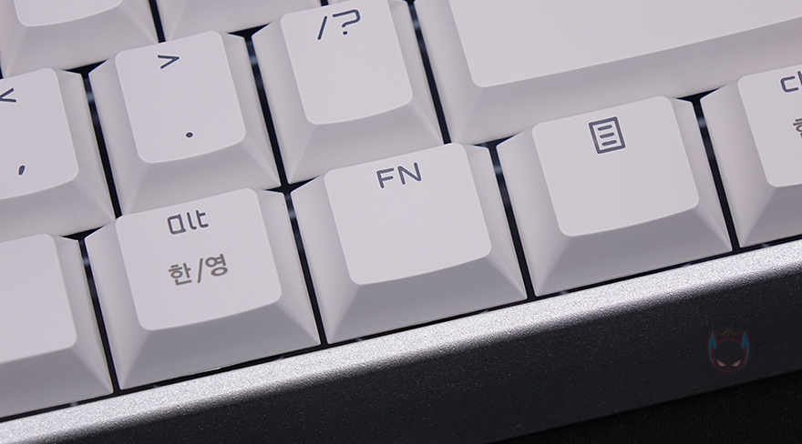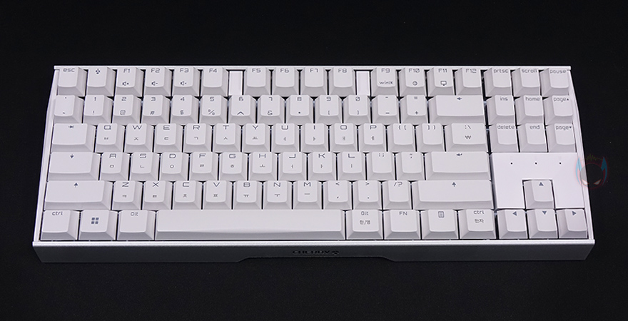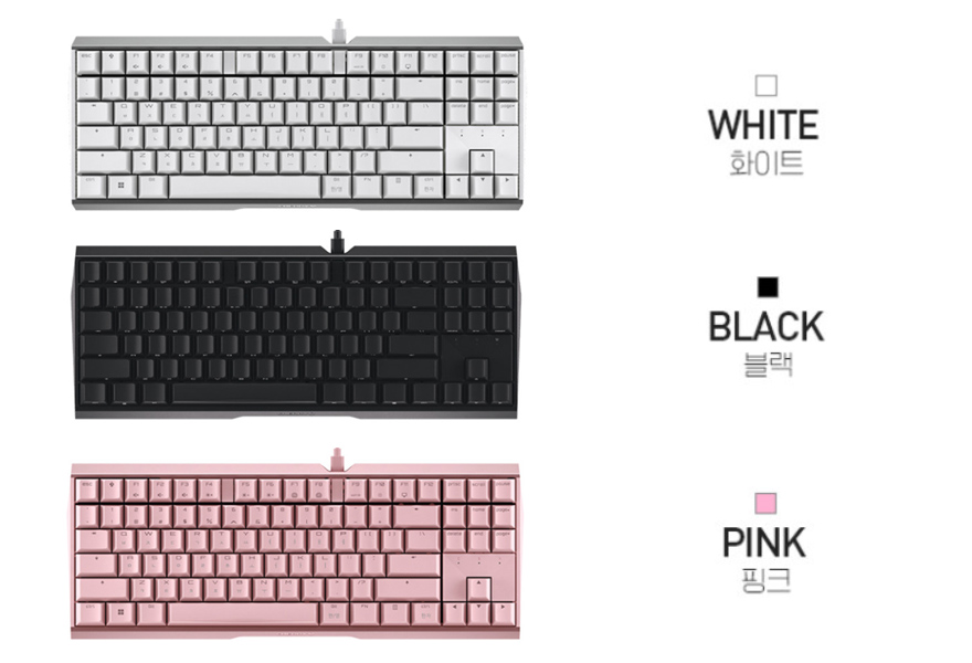 키-캡은 ABS재질에 화이트와 핑크 색상 모델은 영문은 이중사출 방식이며, 한글은 레이저각인이고, 블랙색상 모델은 측면에 영문/한글 모두 레이저각인으로 처리되어 있습니다. 스위치는 체리 MX스위치로 앞서 잠깐 언급했듯이 기존 풀-배열 키보드와 마찬가지로 청축/갈축/적축/저소음적축 4가지 타입 모두 출시되었으며, 스테빌라이저도 체리식으로 윤활처리도 되어있습니다.