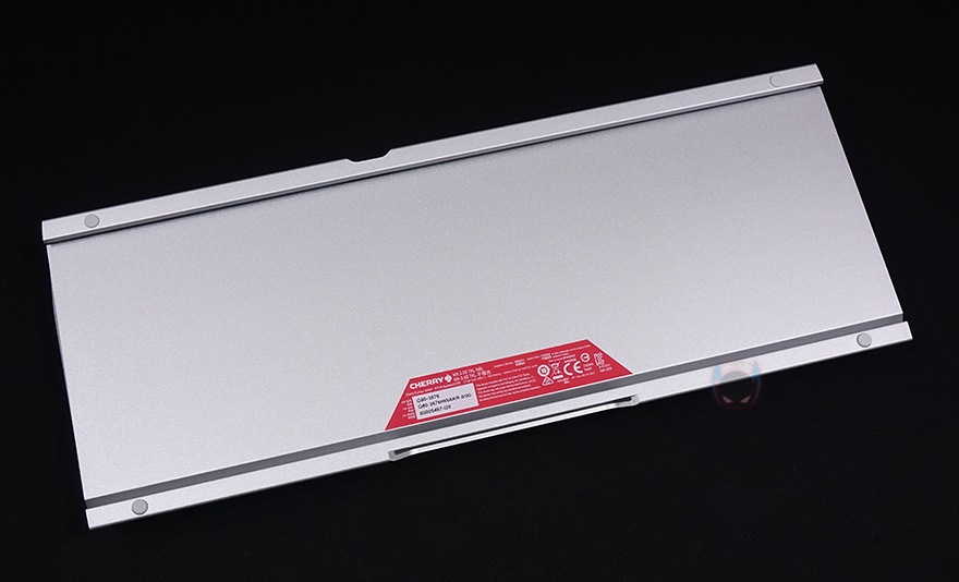 뿐만 아니라 하우징 디자인 역시 풀-배열과 동일하게 통짜 알루미늄 프레임이 키보드를 감싸는 형태로 하우징 아랫부분에도 동일하게 음각으로 체리 로고를 새겨놨습니다. 그리고, 하우징 앞부분에는 분리형 USB 전원케이블과 연결되는 USB Type-C포트가 배치되어 있죠. 알루미늄 하우징은 키보드 밑바닥으로도 그대로 이어지는데, 밑바닥 앞부분에는 MX BOARD 3.0S RGB wireless 키보드처럼 나사형 받침대를 제공해 교체하는 방식으로 높낮이 조절을 할 수 있습니다. 측면에서 보면 타이핑에 최적화라 불리우는 스텝-스컬처2 단계배열도 확인할 수 있죠. 그리고, 통짜 알루미늄 하우징이라 체리 특성인 무보강판임에도 약 813g의 무게감을 가지고 있습니다.