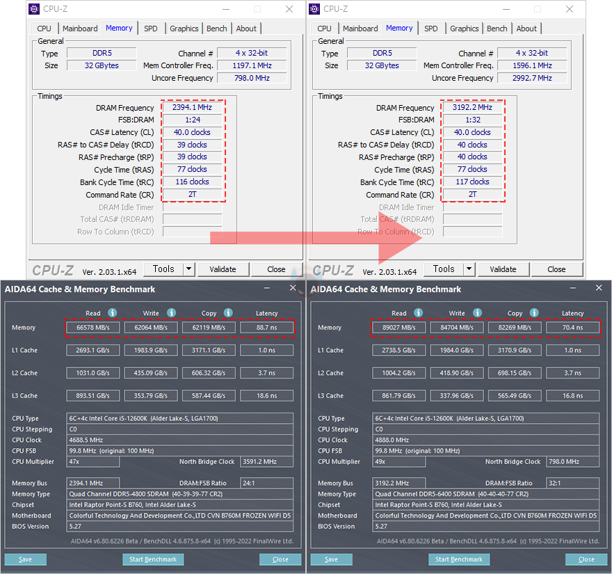 CVN B760M FROZEN WIFI D5 메인보드가 B760 칩셋 기반이기때문에 CPU 오버클럭은 지원하지 않는다고 방금 언급했습니다. 하지만, 메모리 오버클럭(Overclock)은 지원하고 있죠. 실제로 DDR5 메모리 중 X.M.P 프로파일이 적용된 6400MHz DDR5 메모리를 장착해서, CMOS - 메모리 설정에서 XMP 프로파일을 불러오면, 기본작동 4800MHz에서 6400MHz으로 오버클럭 적용된 것을 확인할 수 있고, 성능향상도 확인할 수 있습니다. 물론, 메모리 수동 오버클럭도 가능한데, 리뷰에선 인텔 i5-12600K CPU가 장착되었기 때문에, 6800MHz까지 오버클럭되는 것을 확인할 수 있었죠. 그래도, 앞서 언급했듯이, CVN B760M FROZEN WIFI D5 메인보드는 6400MHz 이상 오버클럭을 지원한다고 했기 때문에, 그 이상으로 적용된 만큼 충분히 메모리 오버클럭은 만족스럽게 지원한다 할 수 있습니다. 참고로, 해외 리뷰에선 13세대 i7-13700K 이상 CPU를 장착했을 때, 7200MHz까지 적용된 사례가 있습니다.