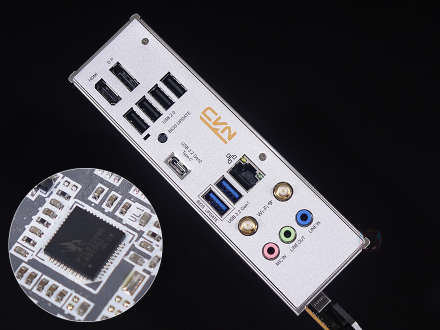 CVN B760M FROZEN WIFI D5 메인보드 레이아웃 끝으로 백패널 I/O 포트 부분을 살펴보면, 경쟁사 제품들처럼 백패널 I/O 포트 쉴드가 기본 장착되어 있으며, 포트 구성에는 HDMI, DP 모니터 출력 포트를 비롯해, USB 2.0 포트 4개, USB 3.2 Gen2 Type-C 포트 1개, 2.5 Gbit 랜 포트, USB 3.2 Gen1 포트 2개, WiFi 6 모듈, 오디오 포트로 구성되어 있습니다. 특히, 보급형 모델임에도 경쟁사 제품들처럼 바이오스 전용 포트와 버튼까지 갖추고 있죠. 참고로, 랜(LAN) 칩셋 역시 리얼텍사 칩셋이며, WiFi 안테나는 앞서 확인한 대로 화이트 색상에 각도조절까지 가능합니다.