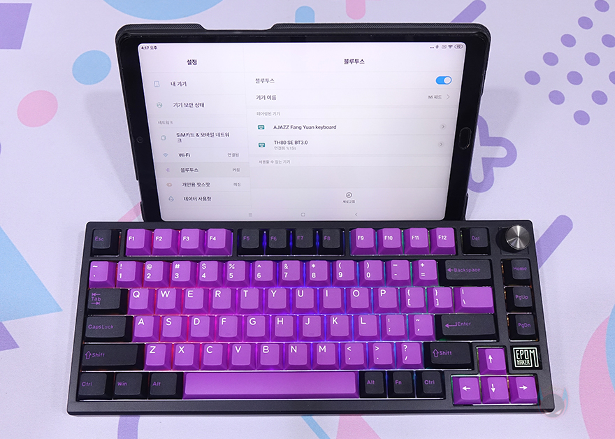 직접, EPOMAKER TH80 SE 미니 키보드를 사용해 보면, 연결은 요즘 3가지 연결방식의 다른 키보드 제품들과 크게 다르지 않습니다. 유선은 그냥 분리형 USB 케이블을 키보드와 PC에 연결하면 바로 사용이 가능하고, 무선 2.4GHz 역시 동글이 수신기를 꽂으면 바로 사용이 가능하죠. 물론, 연결모드에 맞춰서 키보드 밑바닥에 있는 스위치 설정을 해줘야 합니다. 그리고, PC 외에 모바일기기에 사용할 때는 블루투스로 사용하면 되는데, 블루투스는 스위치에서 BT를 선택한 후 전원이 켜지면 Fn+1/2/3 키 중에 디바이스 하나를 선택해서 3초 이상 누르면 페어링 모드가 시작됩니다. 그럼, 연결할 기기에서 TH80 SE BT 3.0과 5.0 2가지 검색되는데 이 중 아무거나 선택하면 연결이 되죠. 그리고, 연결 후에는 노브(Knob)를 통해 돌리면서 볼륨조절을, 누르면 음소거로 쉽게 조절할 수 있습니다. 물론, Fn+F10~F12키도 동일한 기능이고, F1~F2키는 화면 밝기까지 할 수 있죠.