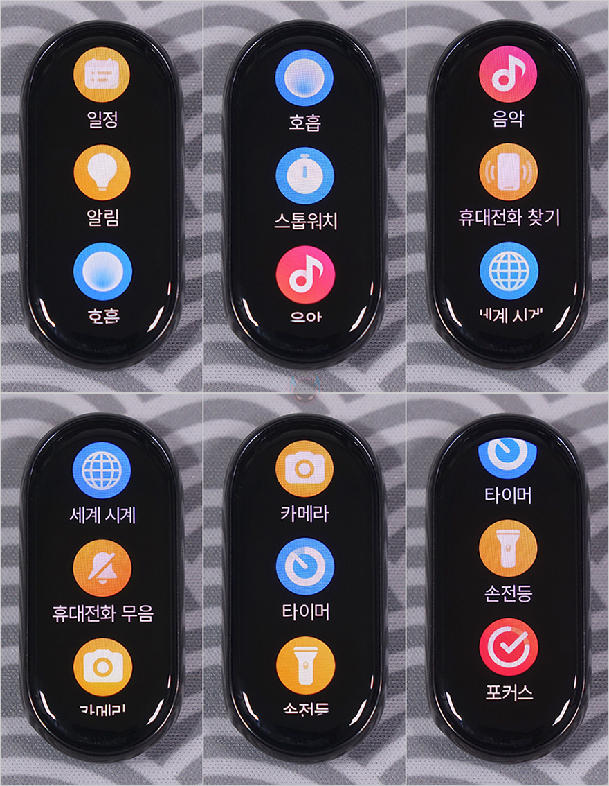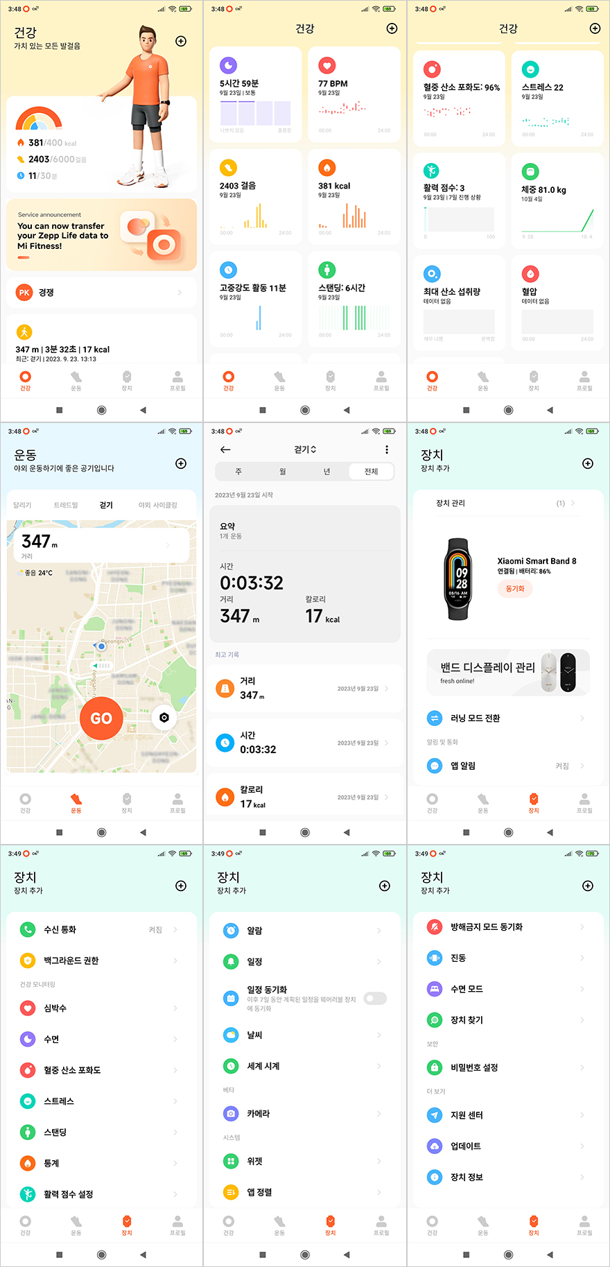 미밴드8 화면을 살펴보면, 앞서 언급했듯이 화면 크기는 1.62인치로 이전 세대와 동일하며, 해상도와 픽셀밀도 역시 192x490, 326 PPI로 동일합니다. 물론, 업그레이드된 부분도 있는데, 바로 최대밝기로 이전 7세대에선 500 니트(nit)였지만, 8세대는 100 니트 높아진 최대 600 니트 밝기를 가졌습니다. 또한, 화면주사율도 최근 샤오미의 스마트워치 제품들처럼 60Hz를 갖춰서 화면 움직임이 더 부드러워졌습니다. 그래서, 화면 메뉴를 살펴보면, 옆으로 슬라이드 했을 때 메뉴는 수면과 심박수, 날씨, 재생, 퀵 메뉴가 나오는데, 퀵-메뉴-설정으로 들어가면 총 12개의 설정메뉴를 확인할 수 있고, 첫 번째인 러닝모드에는 앞서 스트랩에서 언급했던 목걸이용과 신발에 사용했을 때 사용할 수 있는 2가지 모드를 확인할 수 있습니다. 그리고, 밴드 디스플레이를 통해서는 기본 7가지 워치페이스를 탑재하고 있는것을 확인할 수 있죠. 물론, 옆으로 넘겼을 때 나오는 메뉴들은 위젯 방식이라 미-피트니스 어플을 통해서 위젯을 사용자취향으로 추가/변경할 수 있습니다.