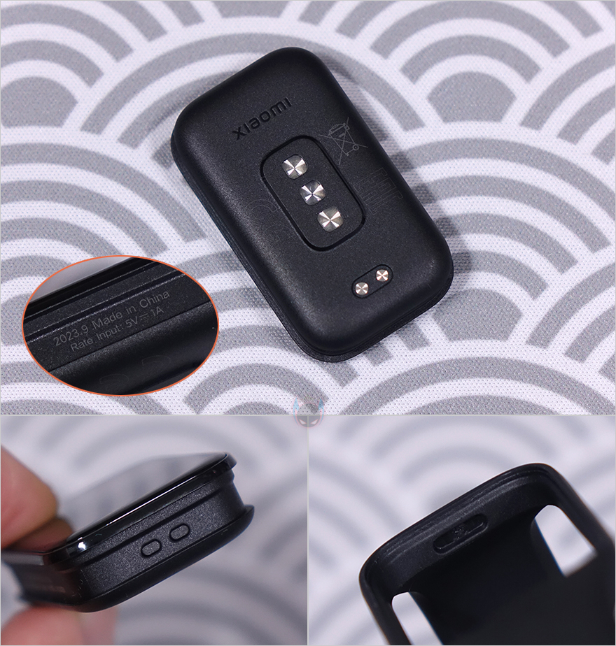 분리한 상태에서 화면 본체 후면을 보면 가운데 센서 부분을 비롯해, 아래에 충전케이블과 접촉하는 접지가 적용되어 있으며, 스트랩에 끼워지는 테두리 홈 측면에는 제조날짜와 충전 전력값을 표기해 놨으며, 홈 위아래도는 스트랩과 결합할 때 고정이 되도록 돌기처리를 해놨습니다. 충전케이블은 약 50cm 길이로 마그네틱 방식으로 쉽게 탈부착할 수 있으며, 함께 출시한 미밴드8의 충전케이블과도 동일하기때문에 서로 호환 사용이 가능합니다.