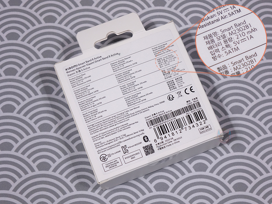 박스 후면에는 한국어를 포함해 각 나라별 언어로 간략하게 제품 사양을 표기해 놨으며, 박스 개봉 부분에는 씰(seal)이 부착되어 있으며, 제품 포장은 기본 비닐 포장이고, 제품구성은 미밴드8 액티브, 충전케이블, 제품설명서로 미밴드8처럼 간단한 구성으로 이루어져 있습니다.