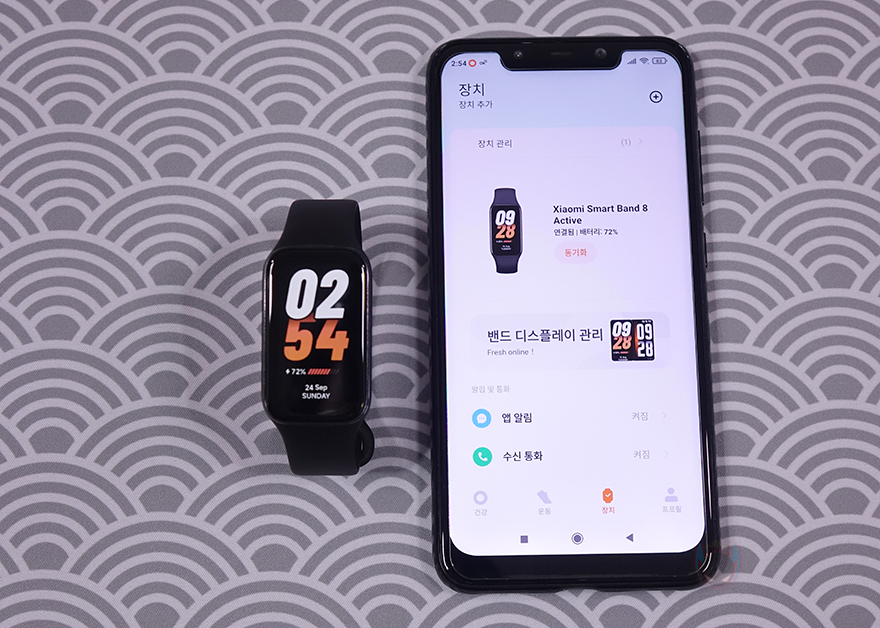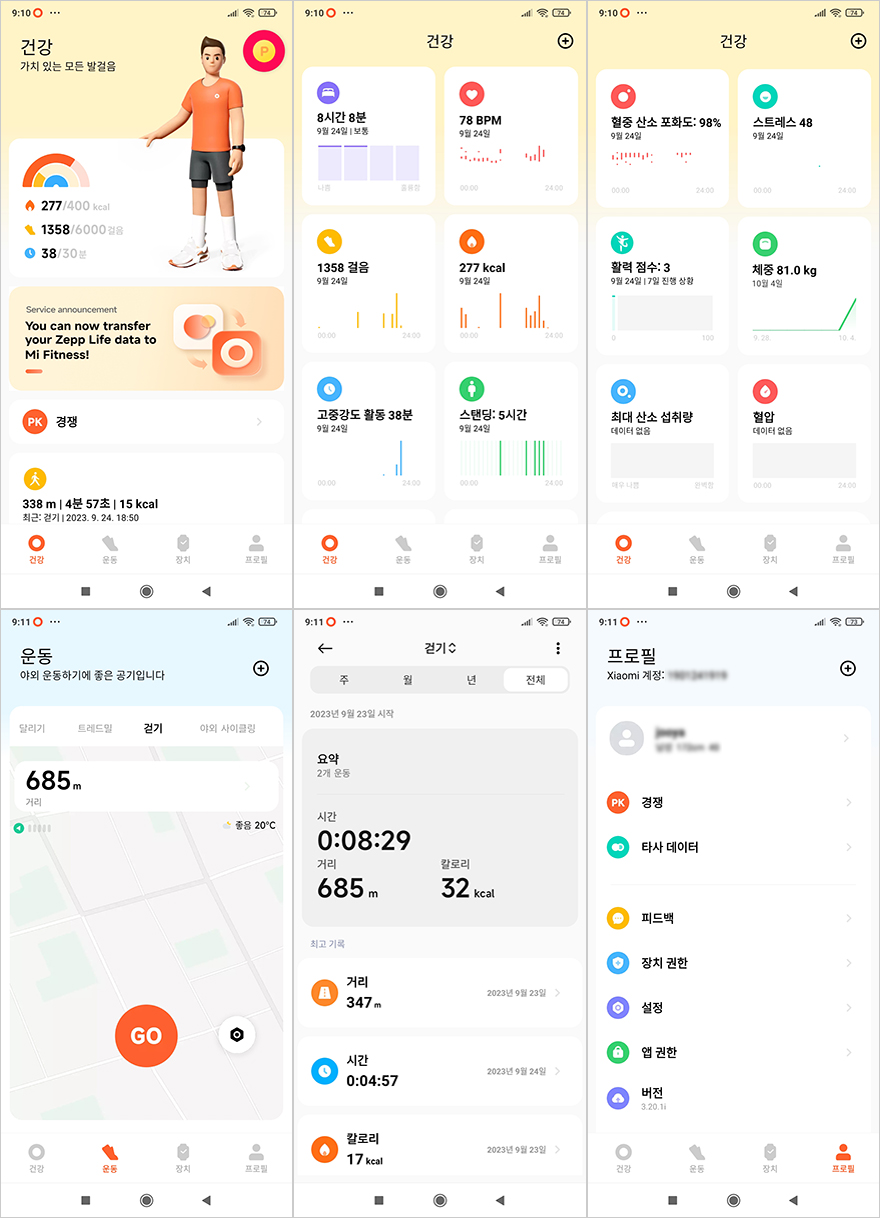 이번엔 미밴드8 액티브와 연동되는 샤오미 웨어러블 공용어플 미-피트니스(Mi Fitness)에 미밴드8 액티브와 연동되었을때 기능들을 살펴보는데, 공용어플이기때문에 기본 메뉴는 건강/운동/장치/프로필로 연결된 기기와 상관없이 동일합니다. 일단, 건강 메뉴에선 활동량, 수면, 심박수, 혈중산소포화도 등 미밴드8 액티브 센서를 통해 측정된 결과값들을 한눈에 볼 수 있으며, 운동 메뉴는 야외달리기/트레드밀/걷기/야외사이클링 운동의 실시간 기록과 저장을 확인할 수 있으며, 프로필은 샤오미계정 및 어플 설정 및 장치 권한 등을 사용자가 설정할 수 있습니다.
