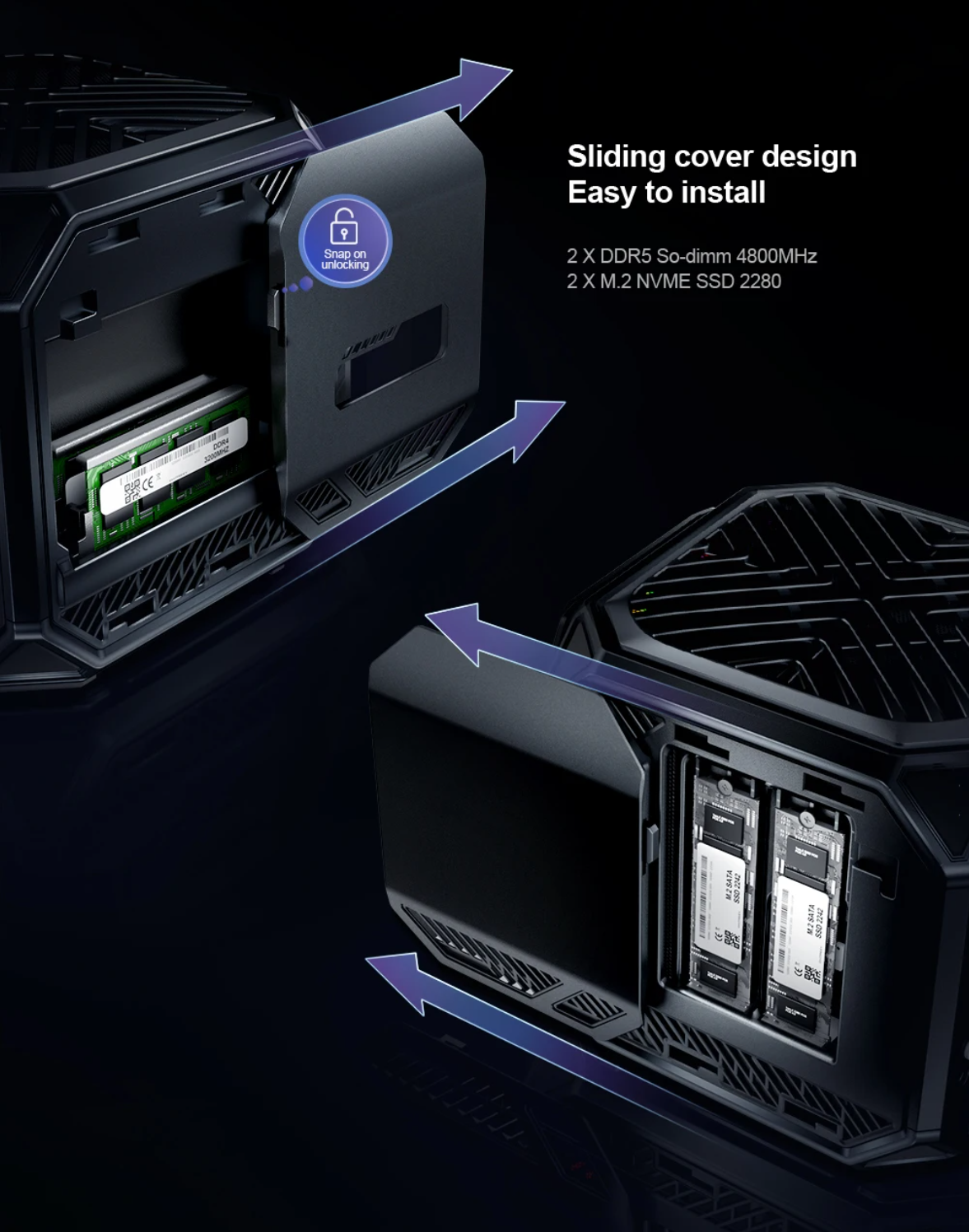 Chatreey TANK 미니 PC는 인텔 12세대(Intel 12th Gen) CPU와 Nvidia의 Geforce RTX 3000 series 조합을 갖춘 미니 PC로 최고 사양은 i9-12900H CPU와 Geforce RTX 3080 옵션까지 나왔다. 인텔 i9-12900H는 14코어/20쓰레드 구조의 최대 부스터 5.0GHz 클럭까지 작동하며, Geforce RTX 3080은 16GB RAM을 탑재했다. 이밖에도 TANK 미니 PC에는 양쪽 측면 슬라이드 패널 방식으로 소비자 손쉽게 메모리(RAM)와 저장장치(SSD)를 교체할 수 있게 지원하는데, 메모리는 DDR5 4800MHz 최대 64GB용량까지 지원하며, SSD는 NVMe SSD PCIe 4.0과 3.0 규격으로 각각 하나씩 갖추고 있다. 또한, Wi-Fi 6와 블루투스 5.0 지원, 전면에 SD Card 슬롯을 비롯해 썬더볼트 겸용으로 USB 4.0 Type-C 포트가 적용되었으며, 4K 모니터도 최대 4대까지 연결 사용할 수 있다.