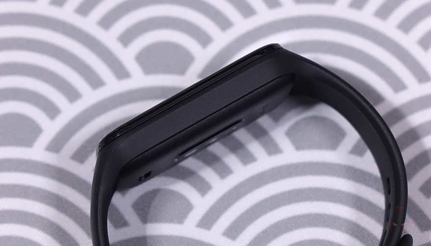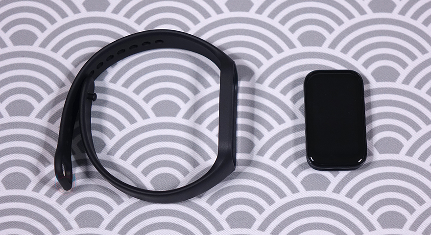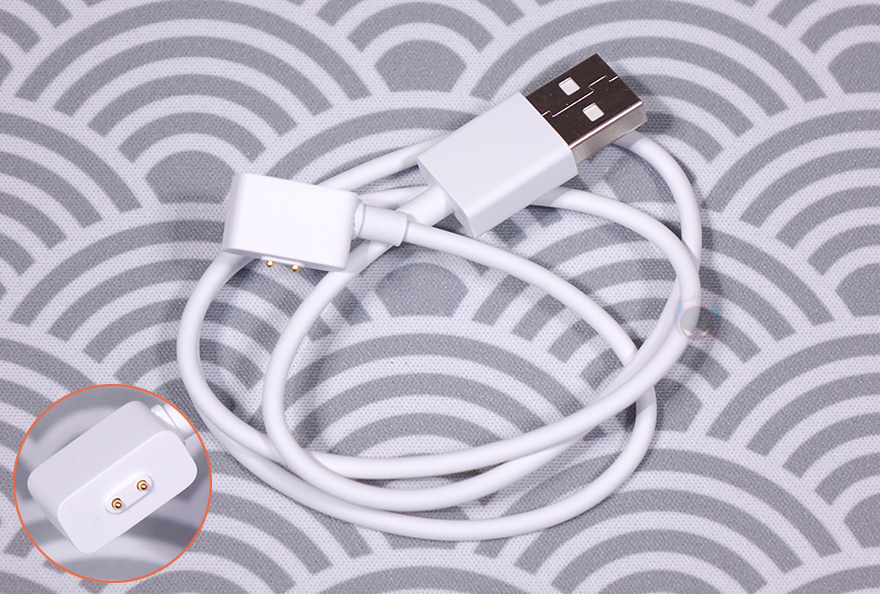 분리한 상태에서 화면 본체 후면을 보면 가운데 센서 부분을 비롯해, 아래에 충전케이블과 접촉하는 접지가 적용되어 있으며, 스트랩에 끼워지는 테두리 홈 측면에는 제조날짜와 충전 전력값을 표기해 놨으며, 홈 위아래도는 스트랩과 결합할 때 고정이 되도록 돌기처리를 해놨습니다. 충전케이블은 약 50cm 길이로 마그네틱 방식으로 쉽게 탈부착할 수 있으며, 함께 출시한 미밴드8의 충전케이블과도 동일하기때문에 서로 호환 사용이 가능합니다.