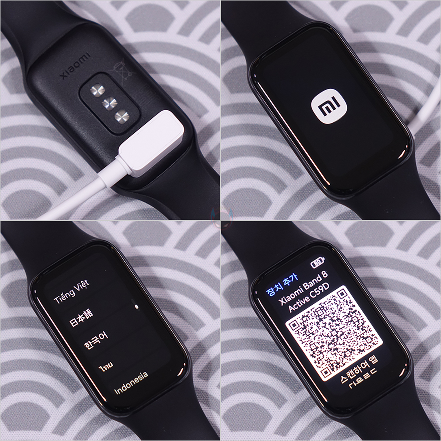 직접, 샤오미 미밴드8 액티브(Mi Band 8 Active) 스마트밴드를 사용해보면, 미밴드8 액티브 역시 기존의 미밴드 제품들처럼 따로 전원버튼이 있는것이 아니라 충전케이블을 연결해서 전원을 켜주고, 처음 사용할 때는 언어설정을 해주고 어플 연동을 진행합니다. 어플은 샤오미 웨어러블 공유어플인 미-피트니스(Mi Fitness)가 사용되며, 장치추가를 통해 진행 안내에 따라 설정하고 마무리하면 됩니다. 참고로, 미밴드8 액티브의 화면 해상도는 172x320입니다.