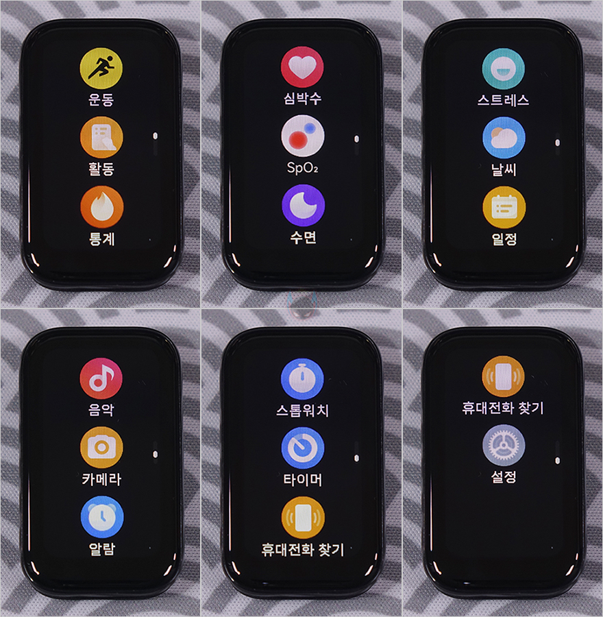 미밴드8 액티브 화면에 나오는 메뉴들을 살펴보면, 옆으로 슬라이드 했을 때 나오는 퀵-메뉴는 음악과 날씨뿐입니다. 물론, 이건 개봉 시 기본 설정이고, 뒤에서 다시 확인하겠지만, 샤오미 웨어러블 어플 미-피트니스(Mi Fitness)를 통해서 추가로 사용자가 취향대로 위젯을 추가시킬 수 있습니다. 그리고, 위로 슬라이드 했을 때 나오는 기본 메뉴에는 '운동/활동/통계/심박수/SpO2(혈중산소포화도)/수면/스트레스/날씨/일정/음악/카메라/알람/스톱워치/타이머/휴대전화 찾기/설정'입니다.