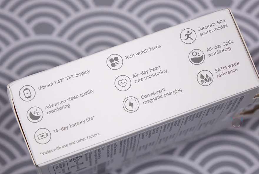 제품 패키지는 박스형태로 샤오미의 다른 웨어러블 제품박스처럼 전면에 제품 이미지를 담고 있어서, 개봉전에 디자인은 간접적으로 미리 확인이 됩니다. 샤오미 미밴드 시리즈에 관심이 많았다면, 한눈에 봐도 미밴드8 액티브 디스플레이 부분이 기본 미밴드 모델과 다르다라는 걸 알 수 있죠. 물론, 박스 측면에 주요 특징을 표기해 놨기 때문에 좀 더 정확히 알게 되는데, 주요 특징으로는 1.47인치 TFT 디스플레이, 많은 워치페이스, 50가지 이상의 운동모드, 고급 품질의 수면 모니터링, 하루종인 심박수와 산소포화도(SpO2) 모니터링, 최대 14일 사용 배터리, 편리한 마그네틱 충전, 50미터(5ATM) 방수를 표기해 놨습니다.