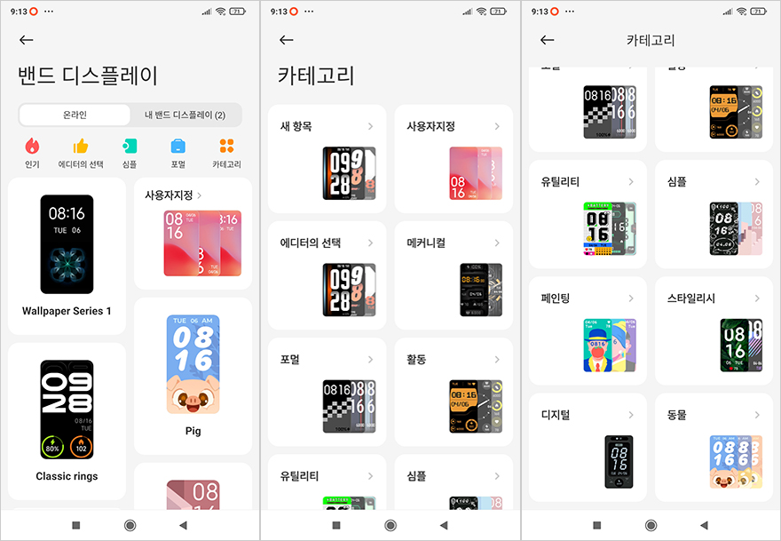 장치 메뉴는 미밴드8 액티브 기기에 담긴 기본 메뉴 기능들의 설정을 어플에서 좀 더 세밀하게 설정할 수 있는데, 미밴드8 액티브가 미밴드8 시리즈 중 가장 저렴한 모델이지만, 심박수나 수면, 혈중 산소포화도(SpO2) 같은 설정은 상위 모델들과 동일하게 실시간 및 하루종일 모니터링할 수 있게 설정할 수 있습니다. 그리고, 앞서 언급했던 기기에서 볼 수 있는 퀵-메뉴 역시 어플에서 추가로 메뉴를 추가할 수 있으며, 기기에서 볼 수 있는 기본 메뉴 순서도 어플에서 변경할 수 있습니다. 또한, 워치페이스 역시 밴드디스플레이 관리로 들어가면 더 다양한 워치페이스들 볼 수 있는데, 총 12개의 카테고리로 분류되고 있으며, 100개이상의 디자인을 제공해주고 있어서 사용자 취향에 맞게 밴드에 저장된 기본 워치페이스 외에 3개를 더 적용할 수 있습니다.