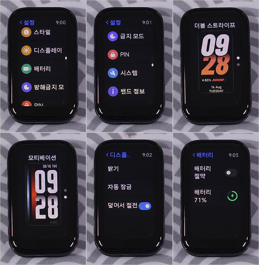 기본 메뉴 중 '운동'메뉴로 들어가면, 야외 달리기/걷기/자유활동/하이킹/야외사이클/트레드밀/줄넘기의 7가지 기본 운동모드가 보이며, 더보기로 들어가면, 야외활동/트레이닝/댄스/구기운동/겨울운동/레크리에이션운동까지 6가지 운동모드를 더 볼 수 있죠. 그리고, 다시 여기서 각 운동모드로 들어가면 세부적인 운동모드들을 다시 볼 수 있습니다. 그래서, 총 운동모드는 51가지를 갖추고 있죠. 그리고, 기본 메뉴에 '설정'메뉴로 들어가면, 워치페이스인 '스타일' 메뉴를 비롯해, 디스플레이/배터리/방해금지모드/PIN/시스템/밴드정보를 볼 수 있으며, 기본 내장된 워치페이스는 2가지입니다. 물론, 워치페이스는 미-피트니스 어플에서 추가로 사용자가 적용할 수 있으며, 디스플레이에선 밝기조절을 할 수 있는데, 미밴드8 액티브 같은경우 최대밝기는 450니트(nit)입니다. 또한, 배터리설정에선 절전모드 활성화도 할 수 있죠.